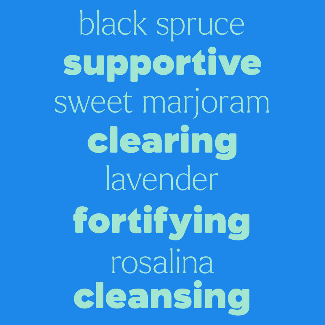 Caprylic/Capric Triglyceride (FCO), Picea Mariana (Black Spruce) Leaf Oil, Origanum Majorana (Sweet Marjoram) Flower/Leaf/Stem Oil, Lavandula Angustifolia (Lavender) Oil, Melaleuca Ericifolia (Rosalina) Leaf Oil, Citrus Limon (Lemon) Peel Oil
