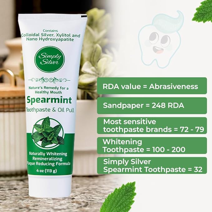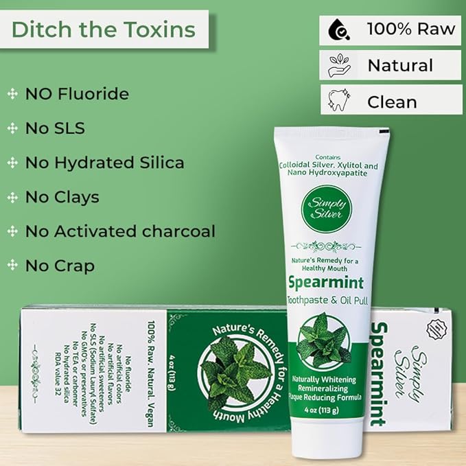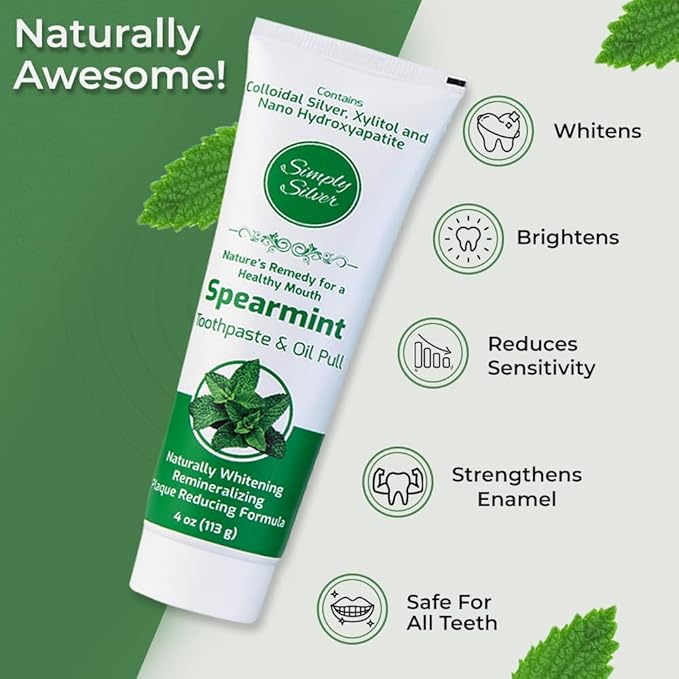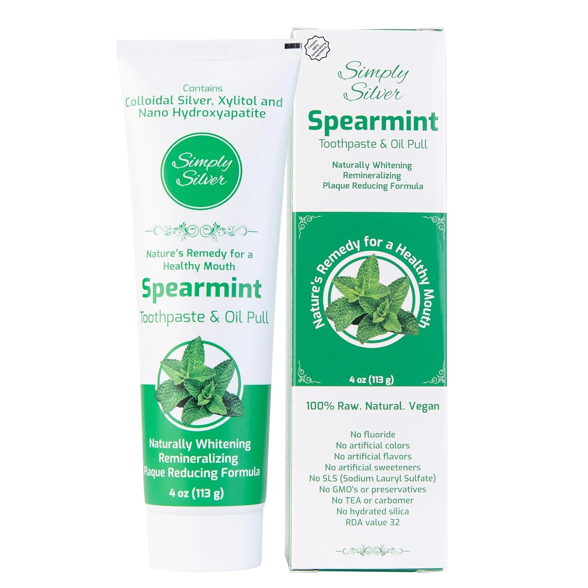 Simply Silver Mouthwash Spearmint Toothpaste & Oil Pull promotes natural teeth whitening, plaque reduction, and remineralization while being free from harmful chemicals such as SLS and fluoride.