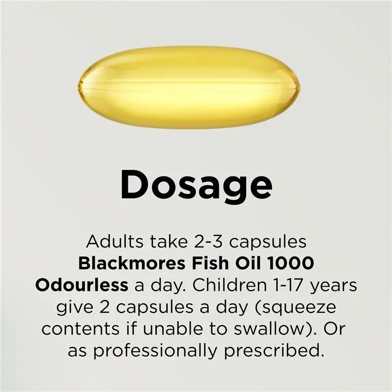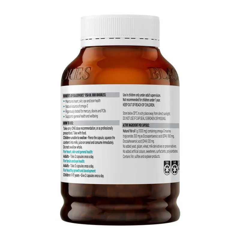 Blackmores Fish Oil 1000 Odourless provides a natural source of omega-3 to support heart, skin, eye, brain health, support cognitive function, nervous system health, general health and wellbeing. Ideal for individuals who do not regularly consume fish.
