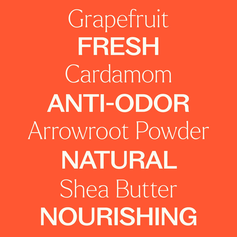 Grapefruit Cardamom Natural Deodorant 清新有效對抗體味。不含合成香精及刺激性化學物質,為傳統止汗劑提供安全有效的替代選擇。